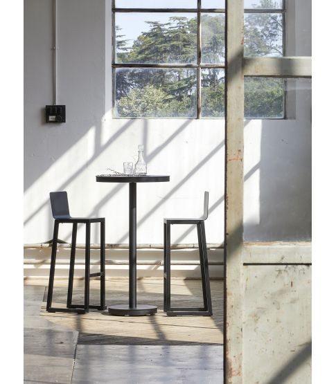 Taburete alto Barcino de Resol, fabricado con estructura, asiento y respaldo de aluminio anodizado pintado. Apilable.