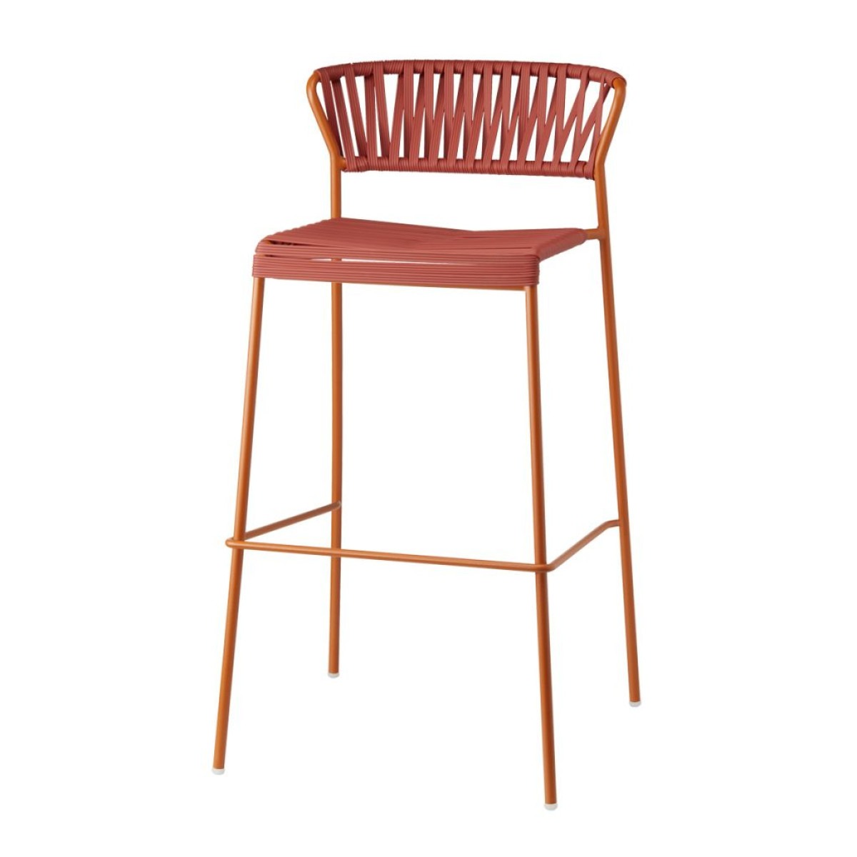 El taburete alto Lisa fabricado con estructura en acero galvanizado pintado, asiento y respaldo en tejido por extrusión de PVC, es ideal ya que combina comodidad y elegancia. Informal y sofisticado a su vez, resulta perfecto para exteriores outdoor en terrazas de hotel o clubs náuticos.