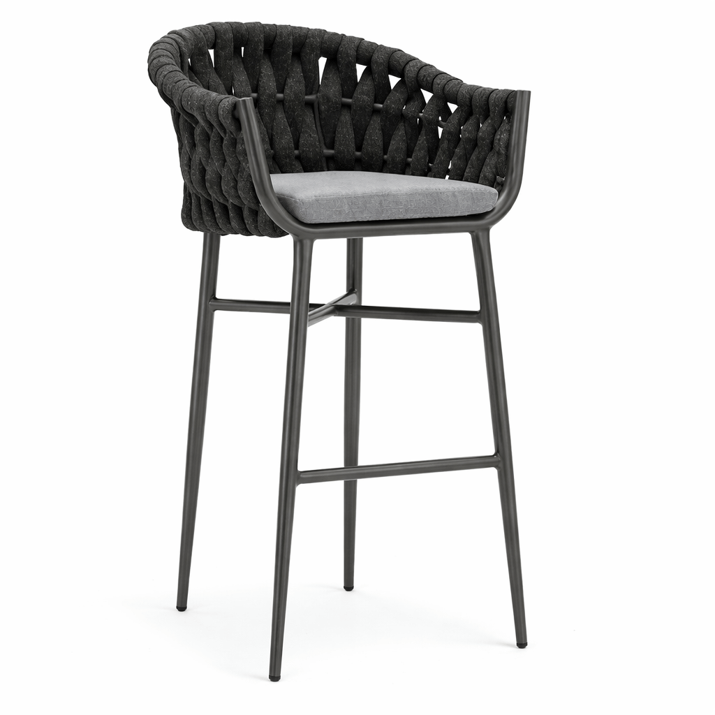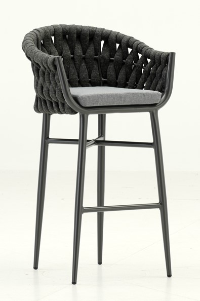 El taburete Viseu en aluminio antracita, asiento y respaldo acabado en cuerda textiline color antracita, es perfecto por su comodidad y elegancia a cualquier establecimiento que tenga barra de bar.