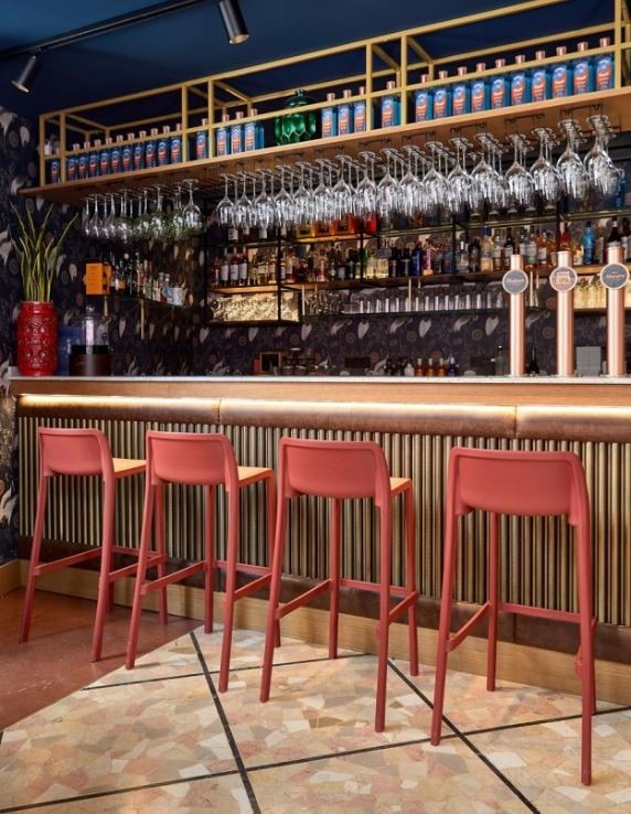 El taburete modelo Attic de Ezpeleta, con líneas sencillas, es ideal para barras de bar y cafeterías que busquen aprovechar el espacio al máximo ya que se puede apilar.