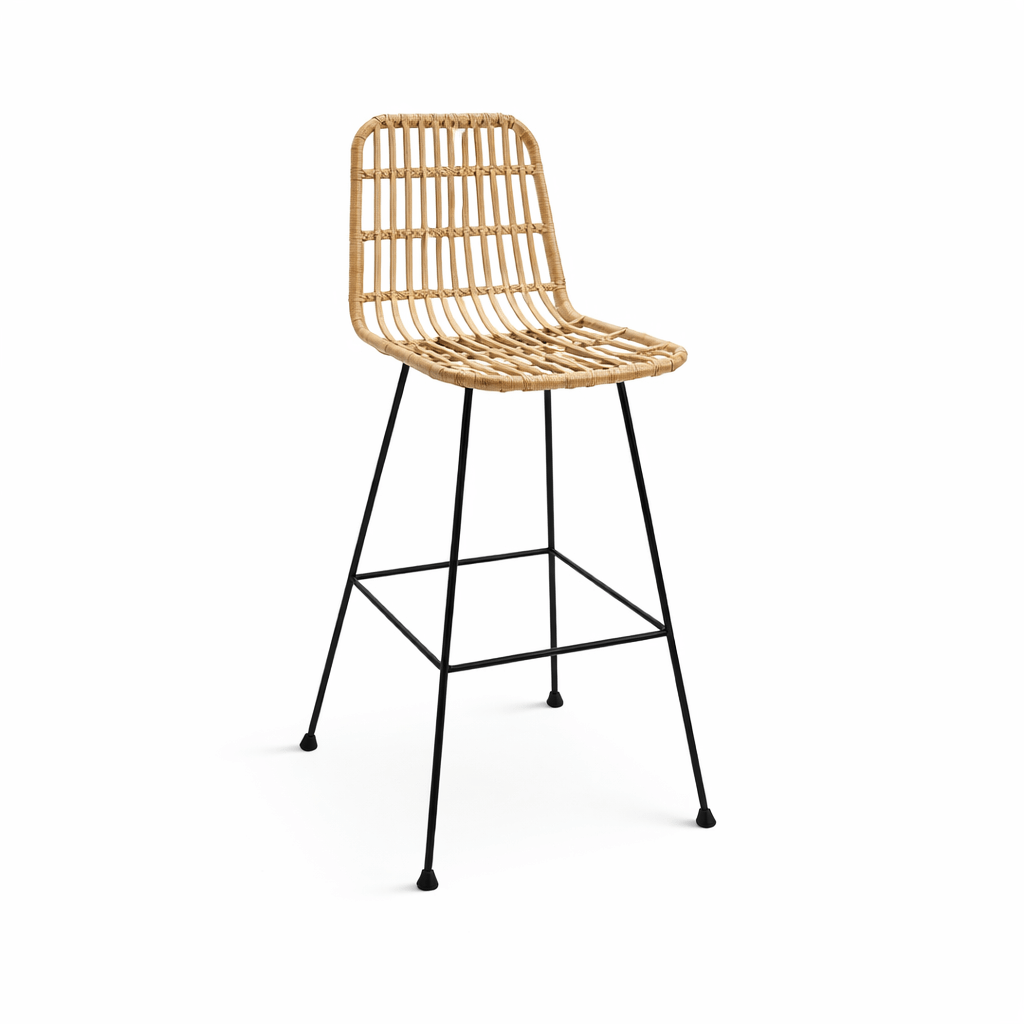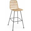 El taburete Erevan fabricado en estructura galvanizada negra y asiento en mimbre sintético de color natural, muy resistente y apto para exteriores.