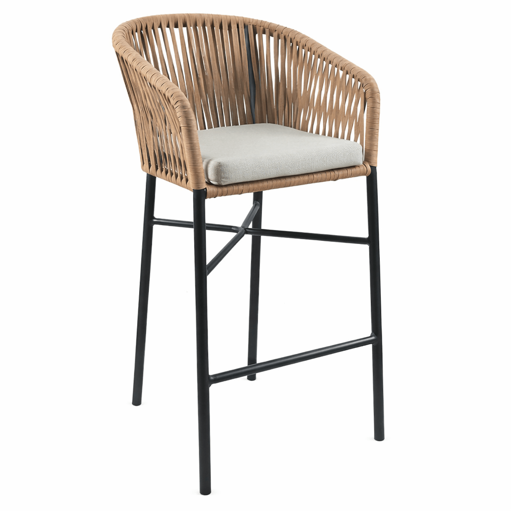 El taburete Tuka en aluminio y cuerda trenzada, es perfecto para dar un toque natural a tu establecimiento.