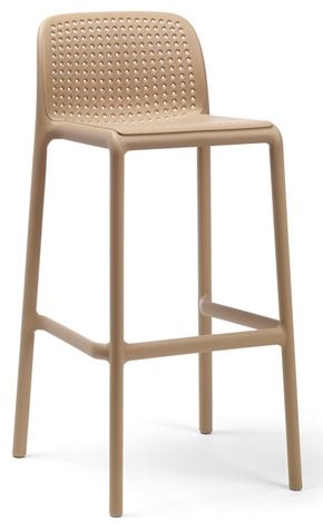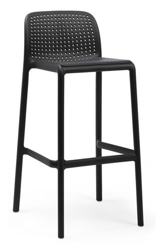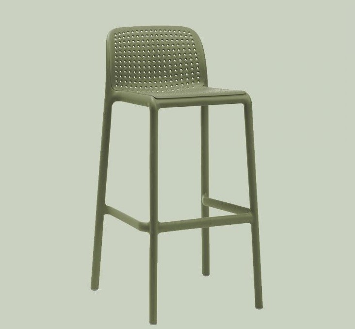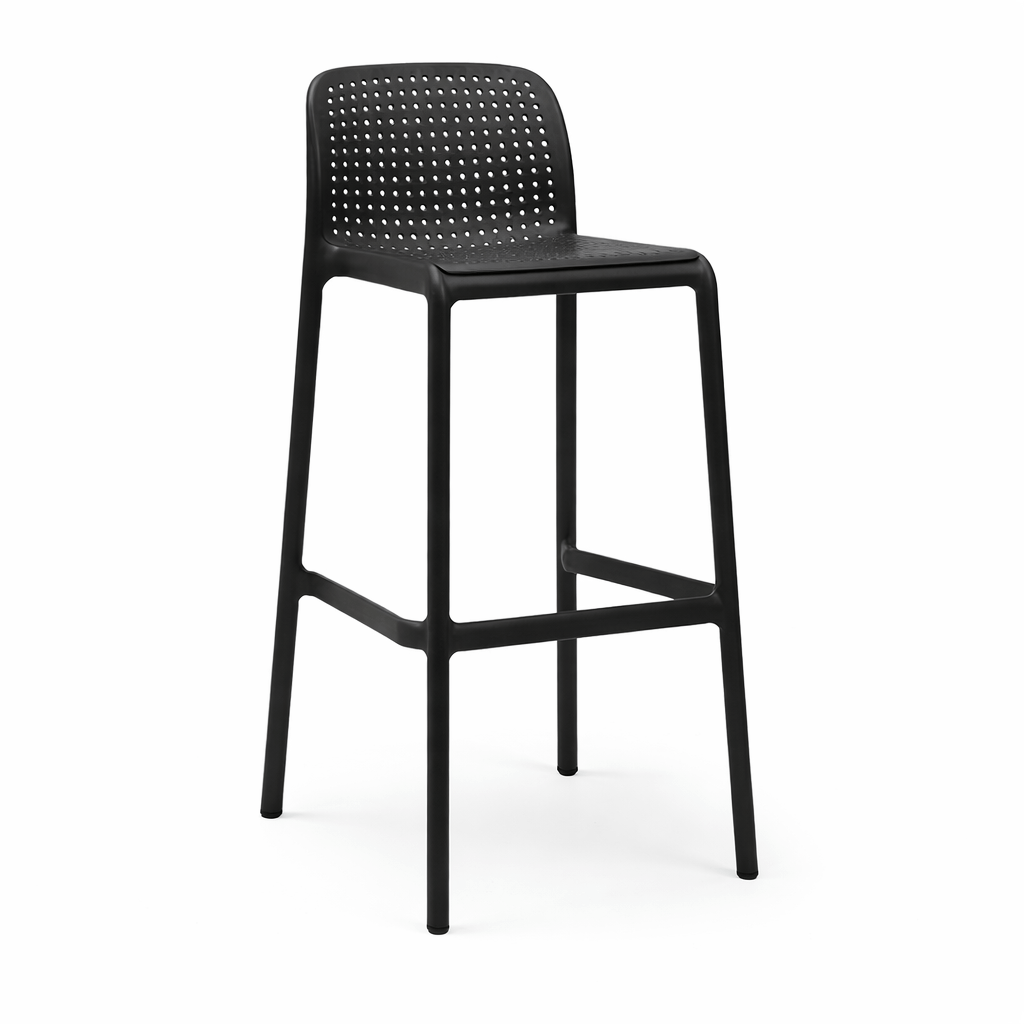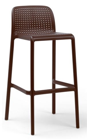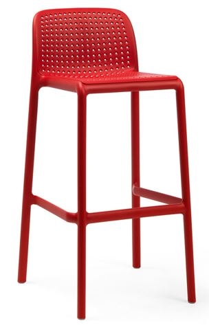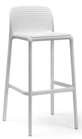 El taburete Lido de Nardi en polipropileno y fibra de vidrio es apilable y lleva tacos antideslizantes en sus cuatro patas.