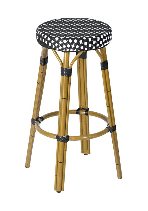 Taburete M5201 fabricado con armazón de aluminio plastificado en color imitación a la caña y asiento a cuadros color blanco y negro de médula sintética.