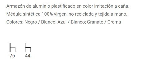 Fabricado con armazón de aluminio plastificado y asiento y respaldo con médula sintética 100% virgen, no reciclada, tejida a mano.