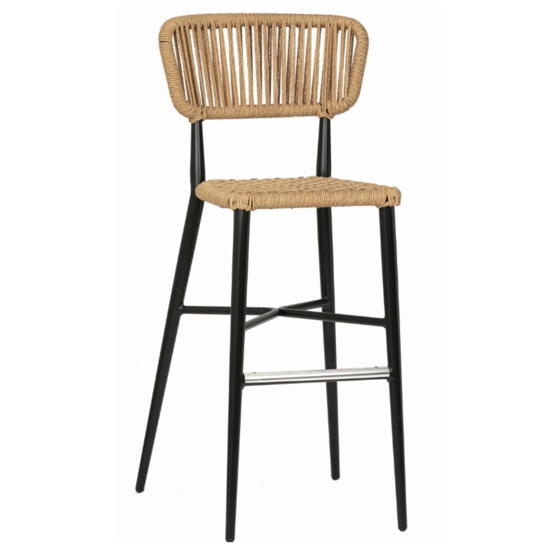 Taburete Provenza fabricado en aluminio negro y cuerda en color crema.