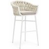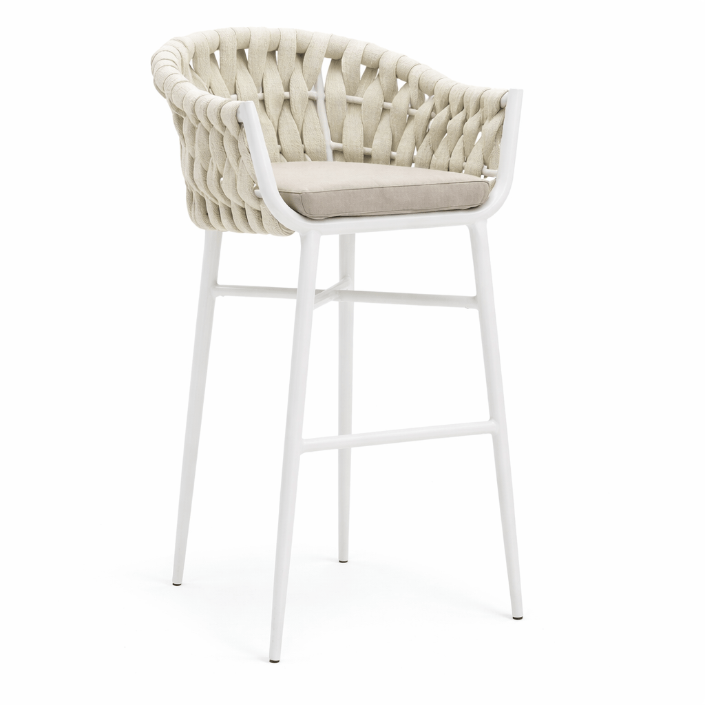 El taburete Tuy con estructura de aluminio y respaldo y asiento en cuerda, es ideal para establecimientos que tenga barra de bar o mesas altas y quieran aportar un aire fresco a su local.