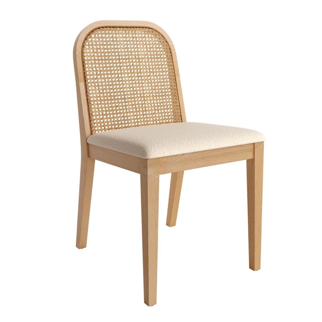 Silla Tila con estructura de madera, respaldo de ratán y asiento tapizado.