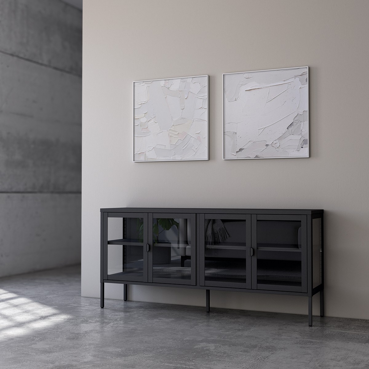 La vitrina Titania en metal y cristal, es una pieza de diseño elegante y contemporáneo perfecta para interiores de estilo industrial, moderno o minimalista.