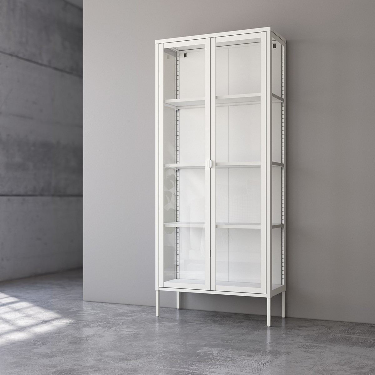 Vitrina Titania, con estructura de metal y puertas de cristal.