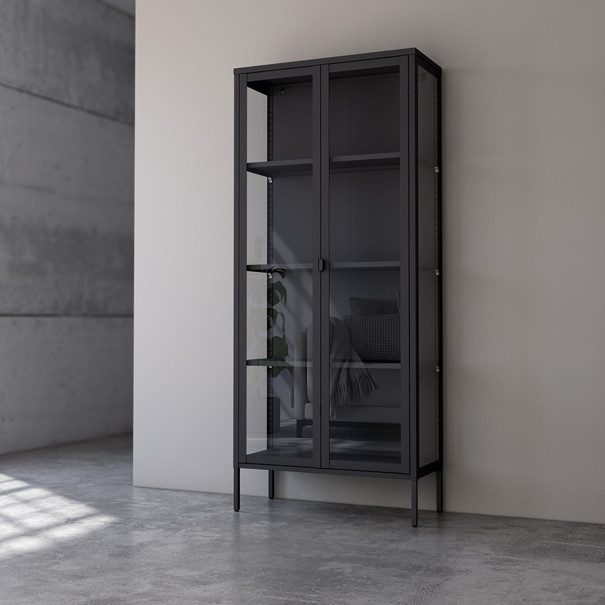 Vitrina Titania, con estructura de metal y puertas de cristal.