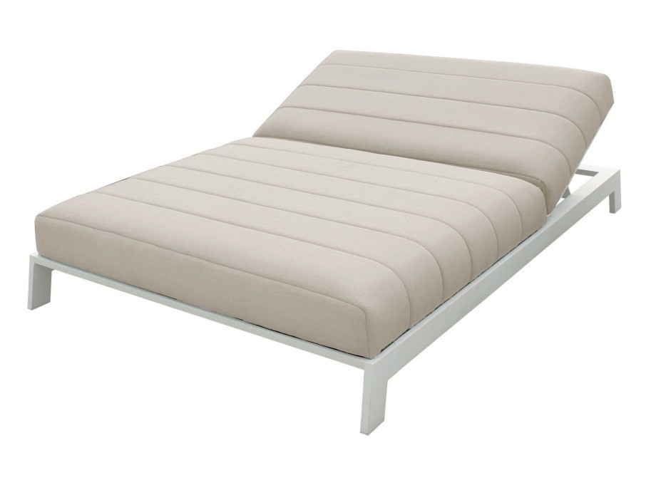 La tumbona cama modelo Samos, fabricada en estructura de aluminio color blanco y espuma tapizada en color natural, es perfecta para usar en piscinas o playas de hotel.
