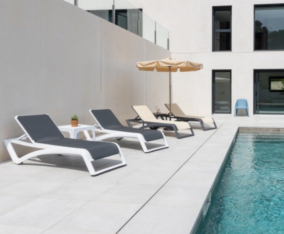 La tumbona Sky Club de Resol, fabricada en polipropileno y fibra de vidrio, es ideal para zonas de piscina en hoteles, camping y apartamentos turísticos que quieran comodidad y funcionalidad.