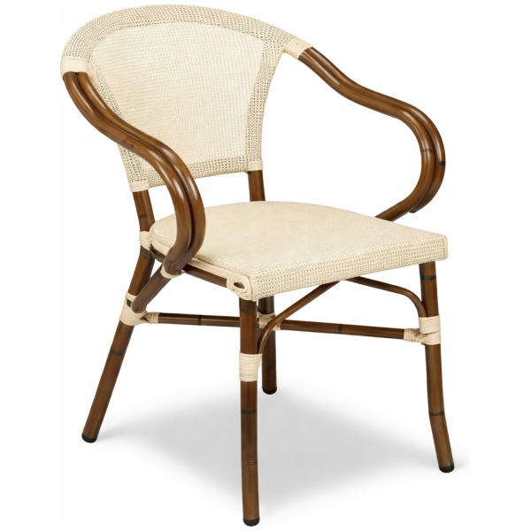 Silla con brazos Odal fabricada en aluminio plastificado imitación caña y textilene color crema. De uso interior y exterior.
