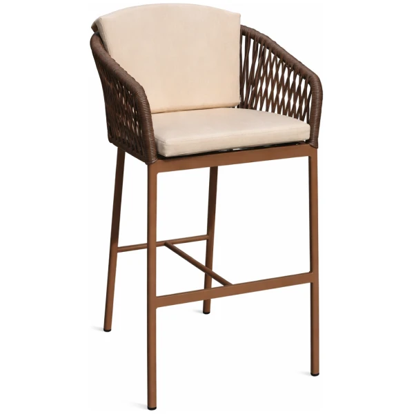 Taburete modelo Guam fabricado estructura de aluminio, asiento y respaldo en cuerda sintética marrón y con cojín color natural.