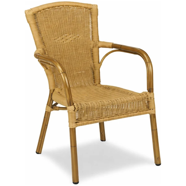 Silla con brazos Hortensia en aluminio plastificado en color imitación a la caña y médula sintética. De uso interior y exterior.