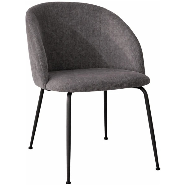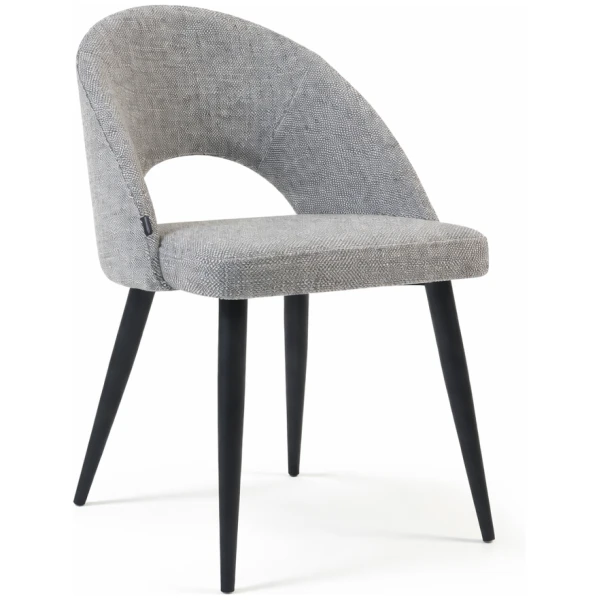 Silla tapizada en tejido color gris perla y patas en metal color negro con un respaldo muy ergonómico.