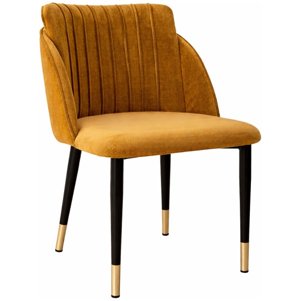 Silla Flam tapizada 100% poliéster mostaza y pata cónica en acero negro con taco dorado.