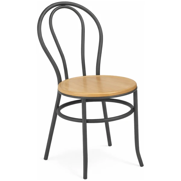 Silla Belfast fabricada con estructura de tubo acerado y asiento en madera. De uso interior.