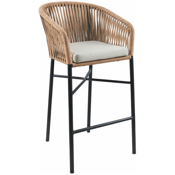 Taburete Tuka en aluminio pintado, asiento y respaldo en cuerda trenzada.