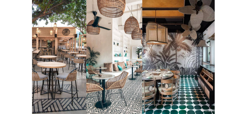 Por ejemplo, unas sillas de ratán natural para las mesas del comedor o unos taburetes de mimbre para la barra pueden aportar ese extra de calidez que buscas con esta decoración.